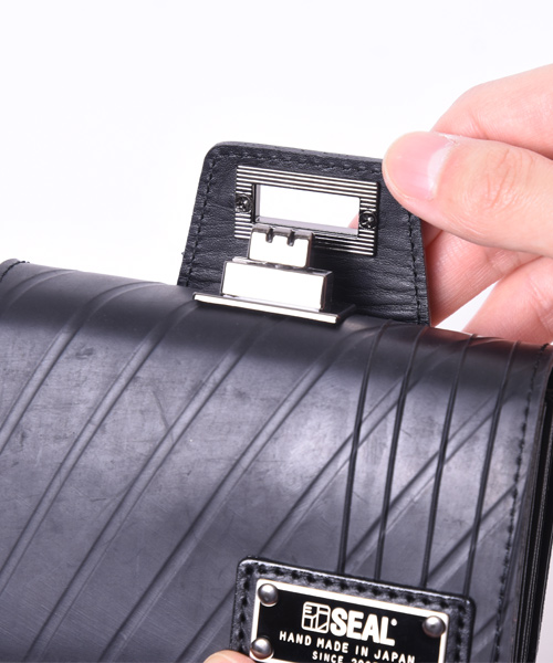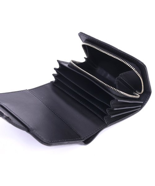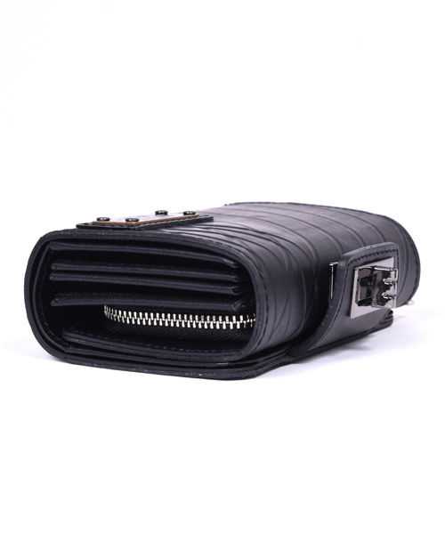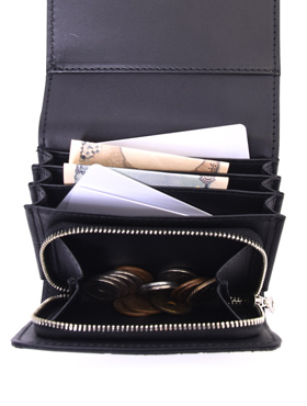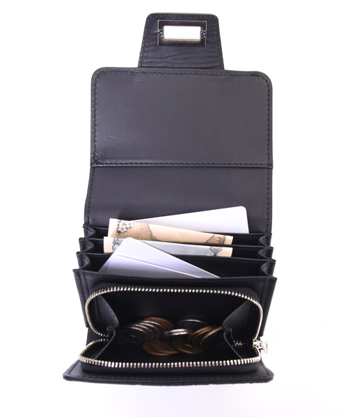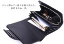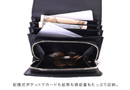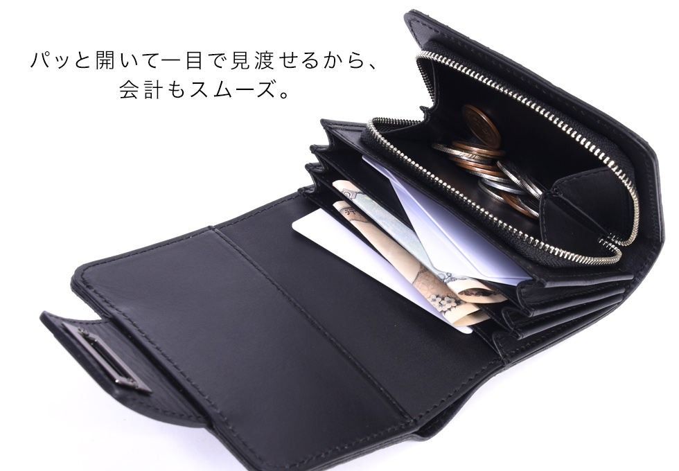 - 蛇腹式のポケットは、ガバッと開いて中身を一目で確認可能。小銭入れも大きく開き、紙幣も折らずにすっきり収まります。