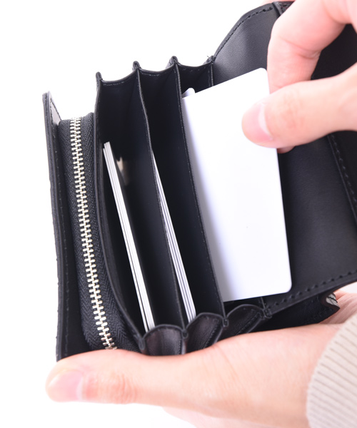 - 手のひらサイズの丸みを帯びたフォルム、蛇腹式ポケットでカードも紙幣も領収書もたっぷり収納。