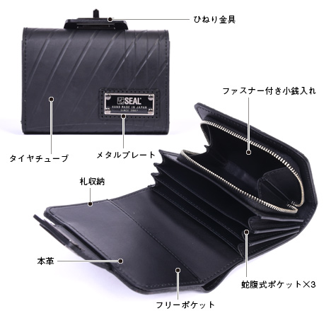 :蛇腹式ポケット×3、フリーポケット×2、ファスナー付き小銭入れ×1、札収納×1 |