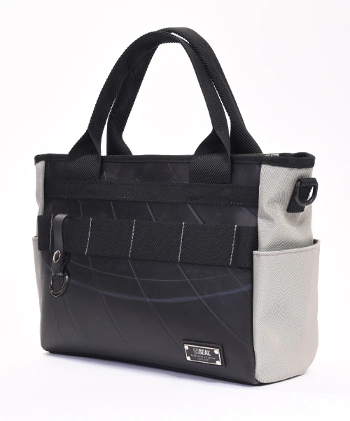 タイヤチューブと撥水性の高いナイロン素材を組み合わせた、防水性・耐久性に優れたカートトートバッグ。雨の日でも安心して使用できます。