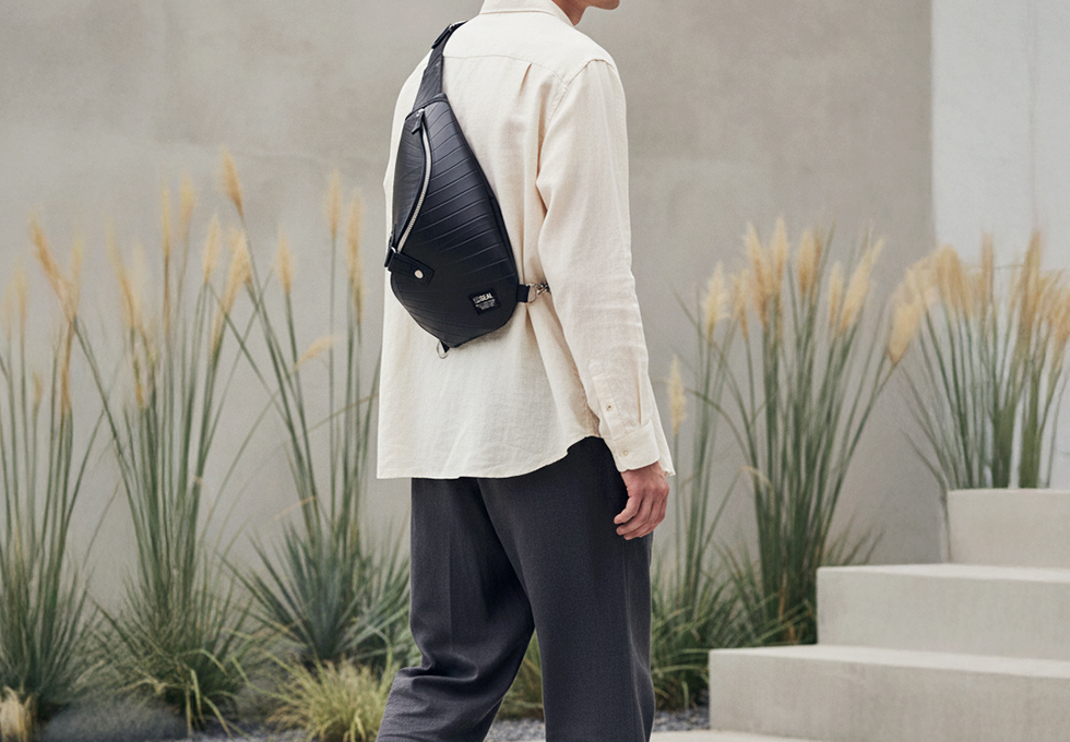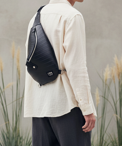 ワンショルダーバッグの人気のフォルムはそのままに。自転車に乗る時などモバイル機器や小物などを入れて気軽にご利用でき、突然の大雨などでも中身を保護してくれる優れものです。このボディバッグは、一個辺り約720gのCO2が削減されます。