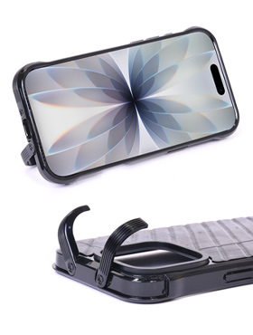 - 4隅に搭載された隠しコーナースタンド。開くとスタンド、フックとして使用でき、開いていない時は